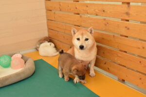 お母さん犬は優しく赤ちゃん犬に寄り添っています😊ちょっぴり甘えん坊の可愛いお母さん犬です♪